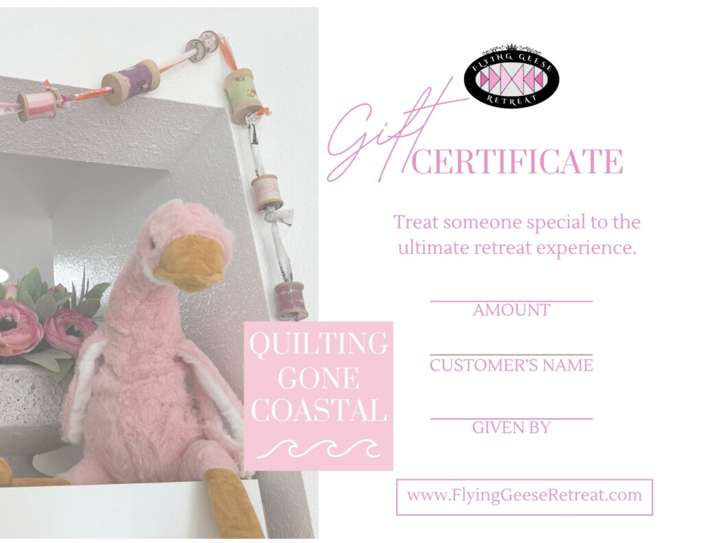 Choose any amount, and your lucky recipient can use it toward any stay at our beachside quilting retreat – where the geese fly, the snacks never judge, and the only thing we take seriously is a good seam. Perfect for birthdays, holiday, “sorry I said that”, or “I love you”.
